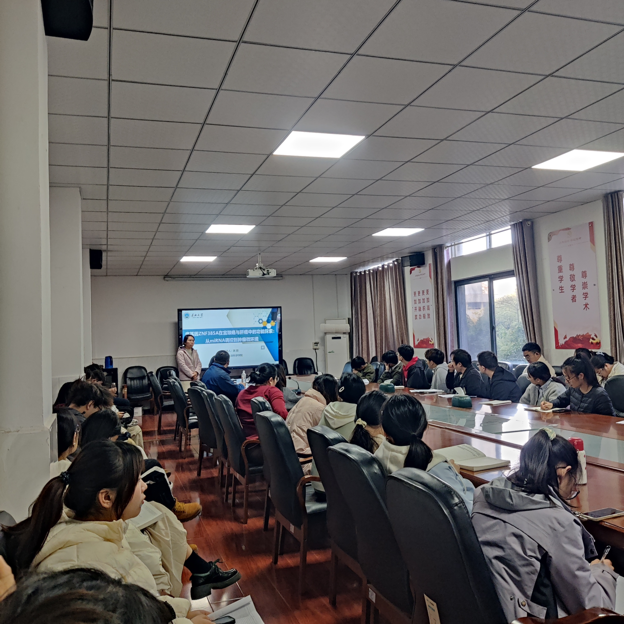 (通讯员:杨笑彦)11月27日下午,生命科学学院在西校区1-217举办求实导师学术沙龙。此次活动由张东辉博士主持。丁保淼教授做题为《基于人工神经网络评估山药淀粉水解度及工艺参数权重》的报告,硕士生导师陈颖做题为《癌基因ZNF385A在宫颈癌与肝癌中的功能探索:从miRNA调控到肿瘤微环境》的报告;硕士生导师李曼菲做题为《玉米苗期耐渍性形成机理的初步探究》的报告;共80余名师生参加。