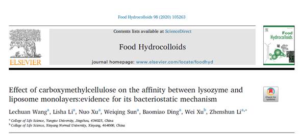 (通讯员 张欣)生命科学学院2017级食品加工与安全专业硕士研究生汪乐川在李真顺博士的指导下于2019年8月在《Food Hydrocolloids》期刊以第一作者在线发表了一篇题名为“Effect of carboxymethylcellulose on the affinity between lysozyme and liposome monolayers:evidence for its bacteriostatic mechanism”(DOI: 10.1016/j.foodhyd.2019.105263)的学术论文,该期刊为农业学科SCI收录的一区期刊,影响因子5.839(2018年)。该论文为汪乐川的研究生课题内容,也是李真顺老师的国家自然科学基金项目“羧甲基纤维素调控溶菌酶抑菌活性的分子机制”的部分研究内容。