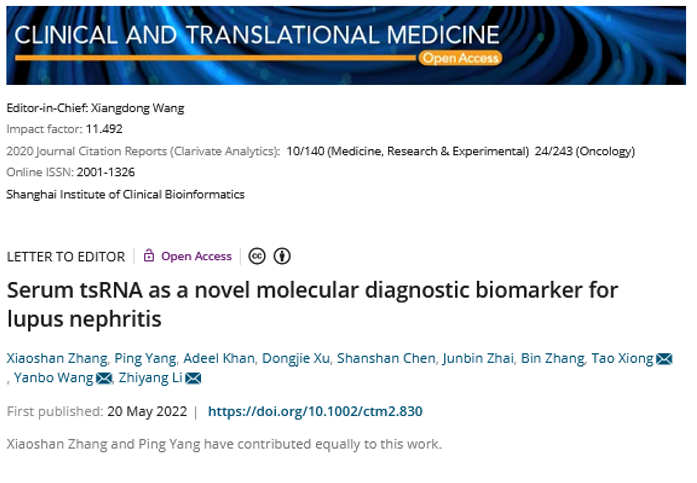 2022年5月20日,长江大学生命科学学院熊涛教授团队和南京鼓楼医院医学检验科李智洋研究员团队合作,在影响因子为11.492的高水平期刊Clinical and Translational Medicine上在线发表了题为《Serum tsRNA as a novel molecular diagnostic biomarker for lupus nephritis》的文章。该文分析了狼疮性肾炎(lupus nephritis, LN)血清中tsRNA的表达谱,首次筛选到LN组中显著高表达的tRF-Ala-AGC-2-M4,并对其诊断价值和分子功能进行了评估和预测。团队成员研究生张孝山和南京鼓楼医院医学检验科杨平主管技师为共同第一作者,熊涛教授为本文的第一通讯作者。