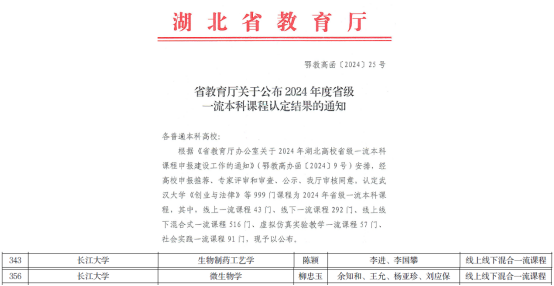 (通讯员:陈颖)近日,湖北省教育厅发布《省教育厅关于公布2024年度省级一流本科课程认定结果的通知》(鄂教高函〔2024〕25号),我院陈颖副教授团队主讲的《生物制药工艺学》和柳忠玉副教授团队主讲的《微生物学》被认定为线上线下混合式一流课程。截至目前,学院共获批省级一流本科课程6门。