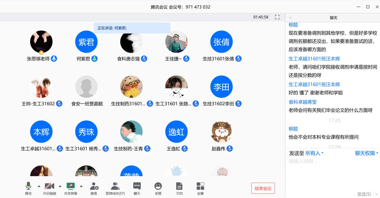 此次会议的流程分为三个部分:第一部分是三位学姐学长分享自己的考研经历以及准备复试的技巧;第二部分是学院领导为同学们给予考研复试、调剂的建议和指导;第三部分便是答疑互动环节。在第一个环节里,原长江大学15级食品科学与工程专业学生,现就读于南京农业大学食品科学与工程专业的黄兰兰学姐、原长江大学15级食品质量与安全专业学生,现就读于江南大学食品科学与工程的李晨彪学长、原长江大学15级生物技术专业学生,现就读于武汉大学遗传学的何紫君学姐,依次为同学们分享自己的考研经验。三位同学结合自身经历从如何搜集复试信息、什么情况下考虑调剂以及复试中的专业课笔试、实验操作、英语听力与口语和专业面试如何准备等多个方面分别进行了详尽的讲解。接着谢书记提醒同学们要做好线上复试的硬件设施和软实力的准备,并且要注意防诈骗;杜院长则是从导师的角度出发提醒同学们复试面试时不要紧张、不要犯低级错误,要注意面试礼仪和精神面貌、要突出重点和个人优点。最后,同学们针对目前还存在的关于考研的疑问进行了提问,比如:调剂复试时间和原专业复试时间是否一致?初试成绩占总成绩的比例?如何在面试中做一个好的自我介绍?等等,学长学姐和老师们都一一予以了耐心的解答。