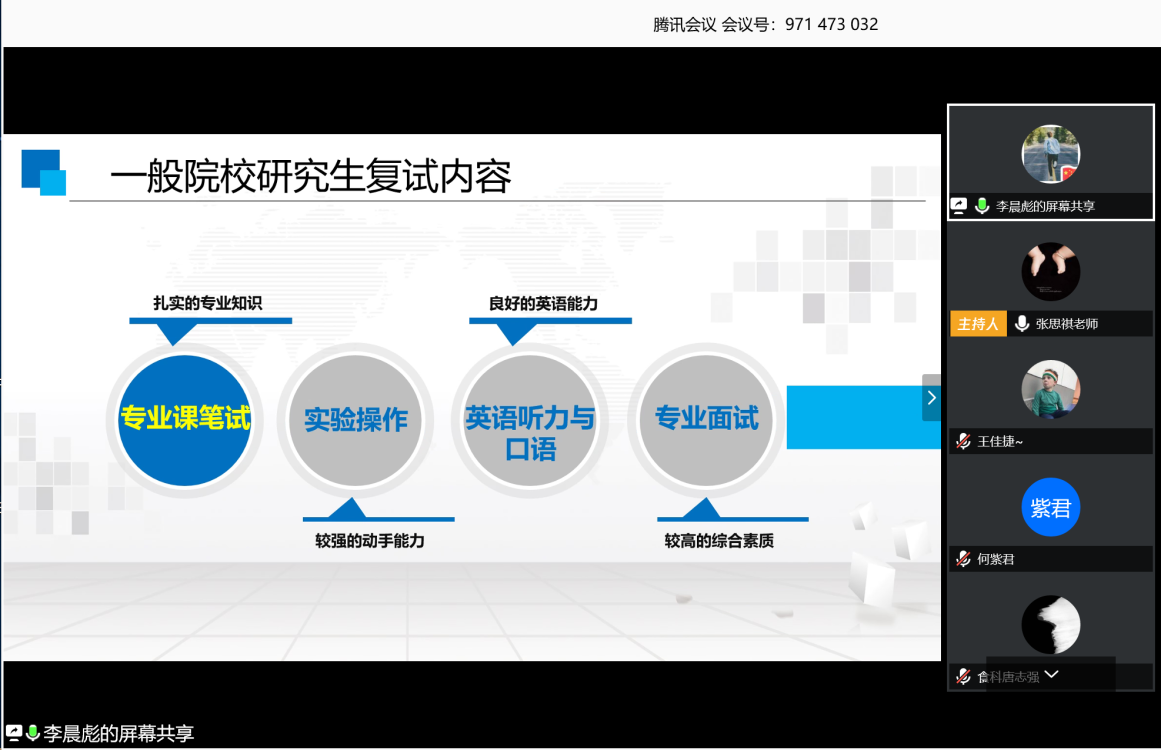(通讯员 张思祺)研究生复试来临之际,为了让同学们对于复试准备更有方向和把握,提高同学们的考研成功率,我院于4月24日下午16时通过腾讯会议开展了毕业生考研复试指导培训会,本次培训邀请到三位2019届长江大学生命科学学院毕业生以及学院领导,就业专干张思祺老师为本次会议主持人,培训对象为我院2020届考研学生。
