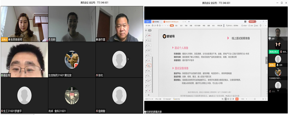 会议伊始,张老师对参与本次培训的老师和同学表示了欢迎,在对主讲人进行了简短的介绍后便由刘主管做网络面试技巧的分享。首先,刘主管告诉同学们找工作前一定要弄明白自我定位和企业需要什么样的人这两个问题,接着从自我介绍、常见面试类型、线上面试准备、线下面试准备、面试现场注意事项和面试礼仪几个方面非常详细的进行了分析讲解,让同学们收获满满的面试干货。随后,谢书记强调了近期网络面试的重要性,提醒同学们合理安排疫情期间找工作的计划,鼓舞同学们行动起来、积极主动地参加面试。分享结束后就是互动答疑环节,许多同学都踊跃大胆的提出自己目前存在的就业问题和困扰,几位老师也都耐心的给予有用的、中肯的回答和建议,同学们对此纷纷表示十分满意。