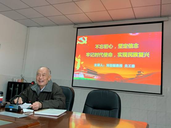 刘伯韬教授通过结合一九四九年前后的自身经历体会以及数据方面的理论和学术使命,从中国共产党人的初心、当今全球形式及八大格局、面对世界变局我们的规划和责任三大板块进行了深度的剖析和生动的讲解。他在讲述中国共产党人的初心时提到“站起来、富起来、强起来是中国共产党人实现初心和使命的历史进程。”他指出,从新中国的建立到第十一届三中全会召开、选择并指引正确发展道路再到中国如今所获得的多方成就,新中国惊人的快速发展和一切成就,离不开我国社会主义制度的选择以及中国共产党的领导。在分析当前全球形势格局时他说道“认清形势、面临形势意味着处于发展的机遇”,他结合当今世界发展主流、世界重心的偏向转移、世界环境治理、第四次科技工业革命显现、中美贸易摩擦等方面向学生们传递了中国将成为领跑者,成为全球典范,引领全球、引导世界青年思想的讯息。在最后一个板块中他则强调“面对全球变局,我们要不忘初心,牢记使命,实现两个百年目标,实现中国现代化和民族复兴。”从严治党,重视人才,抓住机遇,实现科技赶超是世界变局之下的大势所趋,我们应当明确,他同时对学生们寄语并鼓励,当代大学生"要志存高远,勤奋学习,成人成才,打造特色,要有梦想,更要发愤图强。"