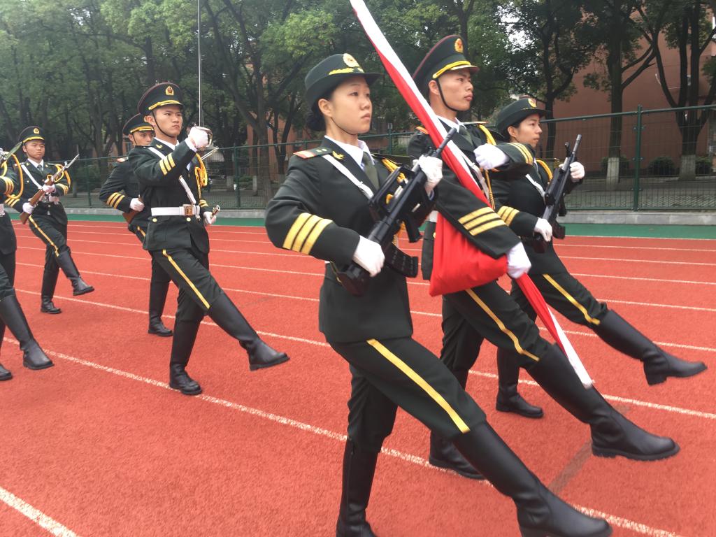7点整,国旗护卫队护送五星红旗入场,在庄严的国歌声中,五星红旗冉冉升起,全体师生注目肃立,向国旗致敬。