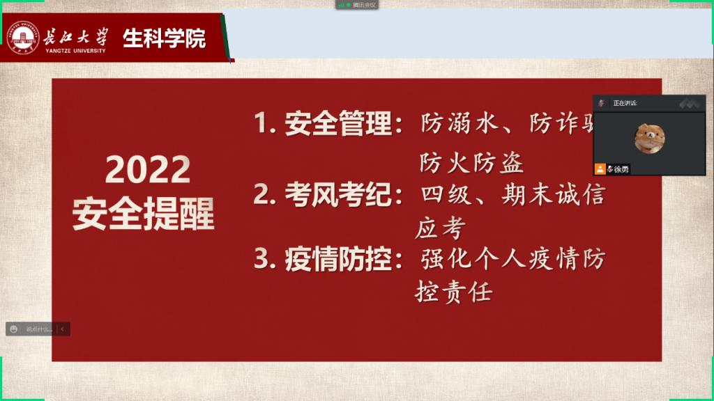 本次会议首先强调了防溺水安全教育,通过播放安全教育微视频倡导同学们严格遵守“非必要不离校、出校必请假”等规定,杜绝近水活动。其次,进行诚信考试及考风考纪教育,以班为单位组织全体参考研究生签署四六级诚信考试承诺书。随后,开展疫情防控教育,学习了近期教育部发布疫情防控相关文件,并进一步宣讲了学校防控政策和要求,要求同学们服从门岗管理,按规定参加学校核酸检测抽检工作。最后,开展反诈安全教育,宣讲防诈骗知识和周围学生被骗案例,提高了同学们防范电信诈骗的意识。