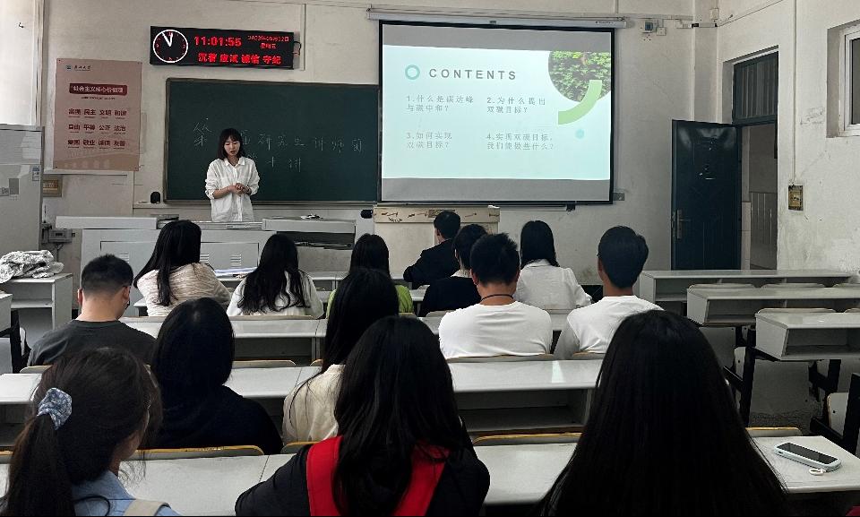(通讯员 扈晓鹏 彭芷芯)长江大学第四届研究生讲师团于5月12日在西校区七教106教室开展第十场专题宣讲活动。讲师团成员翟璐作题为《碳达峰与碳中和——关爱环境,尊重自然》的宣讲,生命科学学院2022级研究生参与活动。