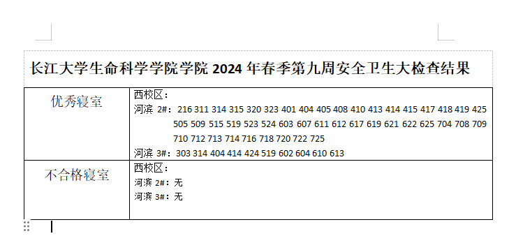 长江大学生命科学学院2024年春季第九周安全卫生大检查结果