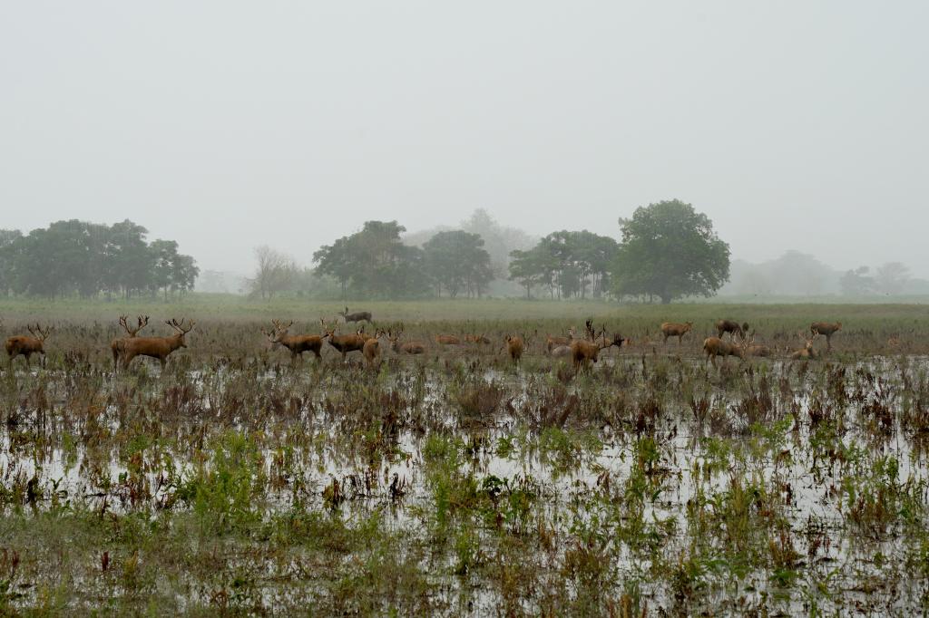 “荆有云梦,犀兕麋鹿满之”,这是《墨子·公输》中对古代楚国云梦泽地区麋鹿生存状态的描述。7月12日清晨,城市的喧嚣还未开始,实践队员经过100多公里的跋涉,如约来到石首市麋鹿自然保护区。在保护区副科长杨涛的带领下,实践队走进湿地,实地考察麋鹿种群。保护区内植被繁盛,郁郁葱葱,树上知了齐鸣,好不热闹!远处,几只雄性麋鹿正低头拱着潮湿的土壤,猛然它一抬头,犄角上挂满了藤蔓和树叶。两只小麋鹿正在泥塘中追逐打闹,呦呦的鹿鸣惹人喜爱。实践队员被这景象深深吸引,纷纷驻足观看拍照。