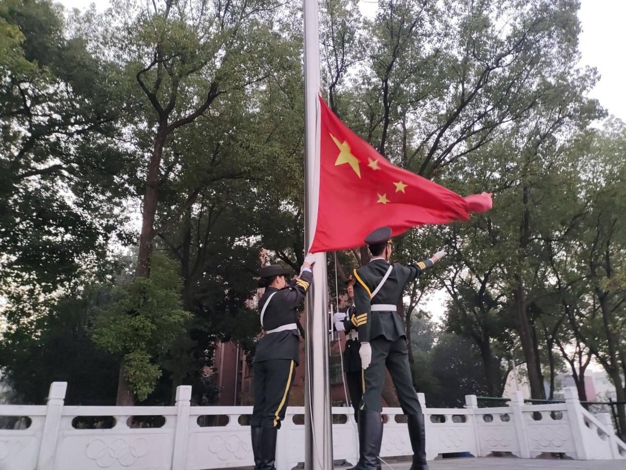上午7点整,升国旗仪式正式开始。国旗仪仗队的同学们迈着整齐划一、铿销有力的步伐,护送着五星红旗正步走向旗杆。全体师生面向国旗肃立致礼。随着激昂的《义勇军进行曲》响起,师生们注视着五星红旗冉冉升起,在熠熠晨光中迎风飘扬。