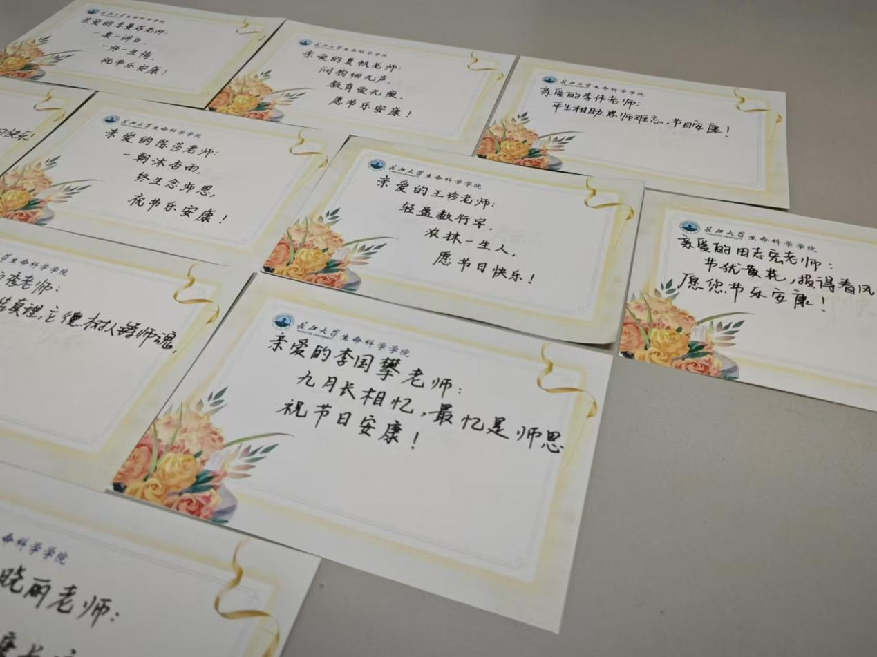 学生们提前准备了精美的贺卡。“九月长相忆,最忆是师恩”“润物细无声,教育爱无痕,愿节乐安康”“精心育人,终身感谢”......学生们相聚一起,在贺卡上写下一句句感恩与祝福。每一句祝福都是学生们用心编织的,对老师的感激之情跃然纸上。