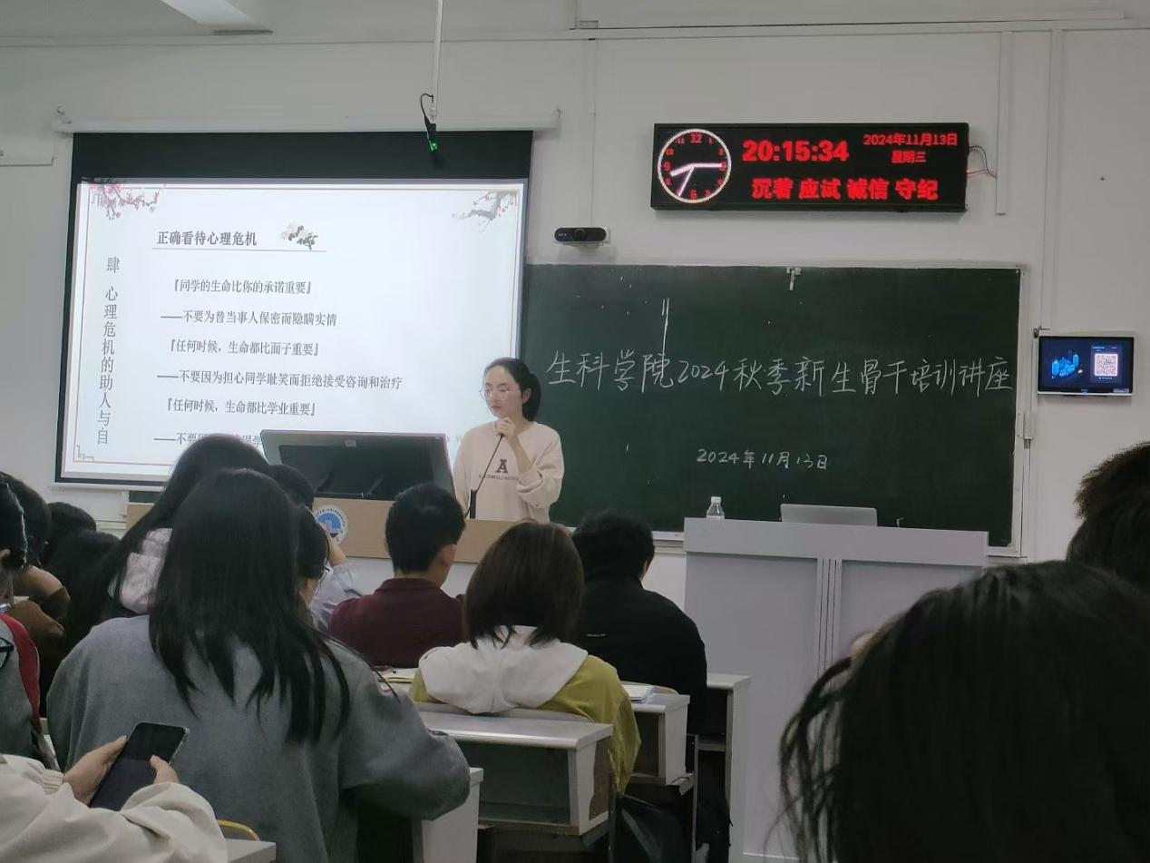 (通讯员 朱翠玲)为进一步提升学生心理健康水平,强化学生心理安全意识,生命科学学院于11月13日晚在西校区7教204室开展秋季学期学生骨干心理健康教育培训。本次培训由心理专干朱翠玲老师主讲,本、研各班级的班长、团支部书记、安全委员、心育委员、寝室长以及学生会心育部人员等120余人。