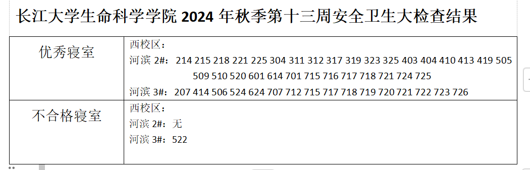 长江大学生命科学学院2024年秋季第十三周安全卫生大检查结果