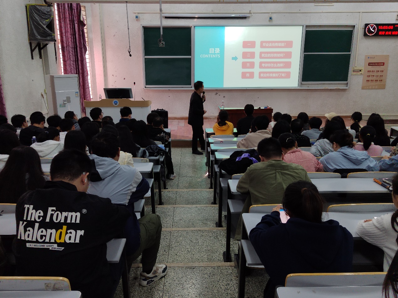 在考研报考院校选择方面,谢书记对近 3 年的考研数据进行分析,深入浅出地为学生阐述了如何根据自身情况合理选择报考院校。此外,讲座还涵盖了毕业去向的多种选择以及对当前就业形势的剖析,同时强调了就业准备的重要性。