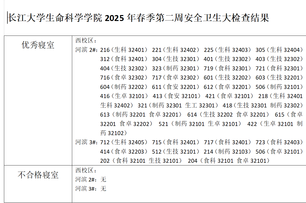 长江大学生命科学学院2025年春季第二周安全卫生大检查结果