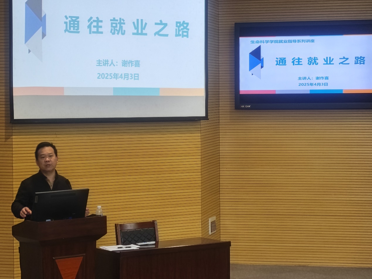 (通讯员 章崇烁)4月3日下午,生命科学学院党委书记谢作喜以“通往就业之路”为主题,在农科大楼1056学术报告厅为2026届毕业生作专题讲座。本次活动共有200余名学生参与,现场互动热烈。