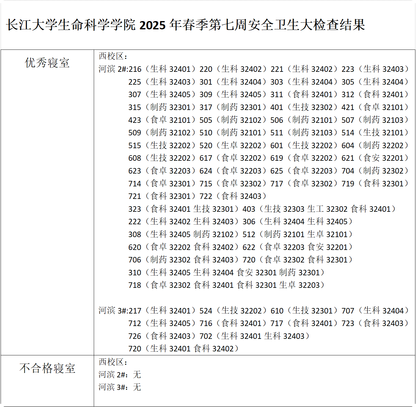 长江大学生命科学学院2025年春季第七周安全卫生大检查结果
