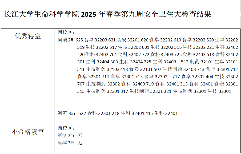 长江大学生命科学学院2025春季学期第九周安全卫生大检查结果