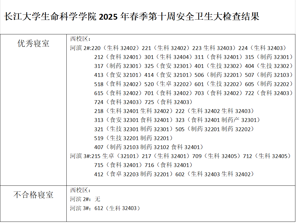 长江大学生命科学学院2025春季学期第十周安全卫生大检查结果
