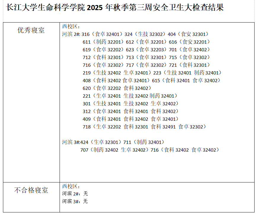长江大学生命科学学院2025秋季学期第三周安全卫生大检查结果