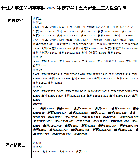 长江大学2025年秋季学期第十五周卫生大检查结果