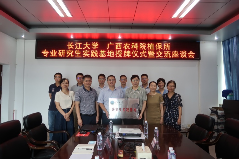 (通讯员 孙文秀)7月4日,我院“专业硕士研究生实践基地”授牌仪式在广西农科院植保所举行,学院党委书记蔡哲斌、副院长孙卫青、生物系党支部书记系副主任孙文秀,广西农科院植保所所长于永浩、党委书记韦善富、副所长杨朗、邓铁军及专家、博士代表参加授牌仪式。仪式后双方就人才培养、科学研究等方面的合作深化拓展进行了交流座谈。