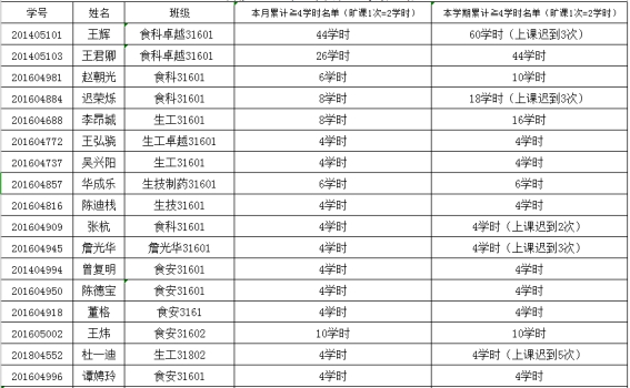 根据课堂考勤结果,累计旷课2学时的,34名同学;累计旷课4学时及以上的(旷课1次=2学时),17名同学;迟到19人次。严肃校风校纪,督促学生按时到课,及时教育违纪学生,根据《长江大学学生违纪处分办法》第十五条、《生命科学学院课堂考勤实施办法》,经学工办研究决定,对本月累计旷课4学时以上,迟到2次及以上的同学予以通报批评: