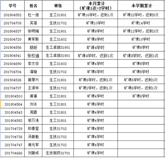 本月课堂出勤情况较差,根据课堂考勤结果,累计旷课2学时的,17名同学;累计旷课4学时及以上的(旷课1次=2学时),18名同学;迟到3次及以上的,3名同学。为严肃校风校纪,督促学生按时到课,及时教育违纪学生,根据《长江大学学生违纪处分办法》第十五条、《生命科学学院课堂考勤实施办法》,经学工办研究决定,对本月累计旷课4学时及以上、迟到2次及以上同学予以通报批评: